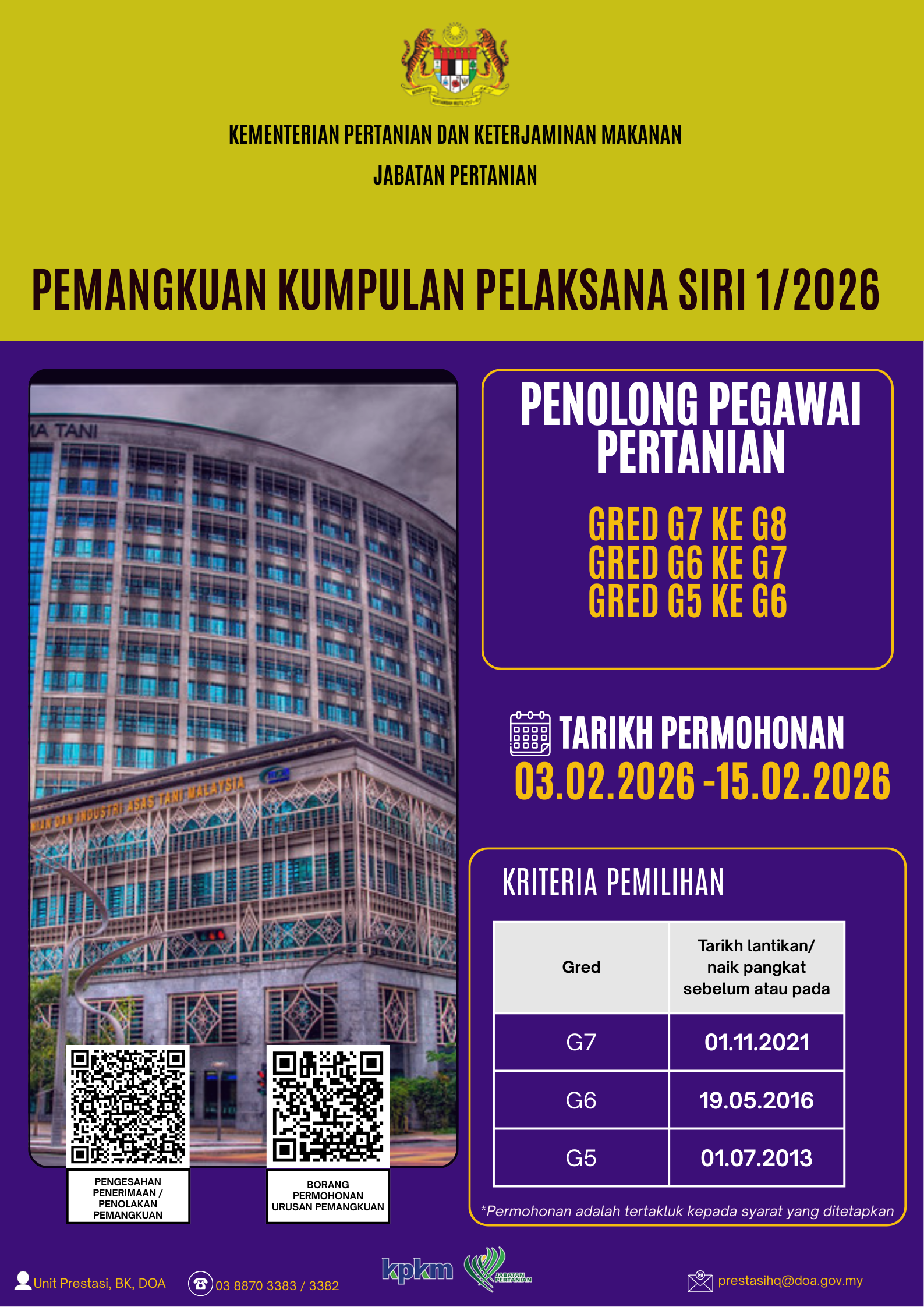 - Tawaran Pengisian Kekosongan Bagi Jawatan Penolong Pegawai Pertanian Melalui Kaedah Pemangkuan di Jabatan Pertanian Malaysia.